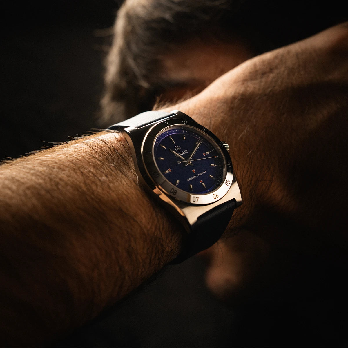 En partenariat avec Delugs, le choix du caoutchouc FKM s’est imposé pour sa souplesse, sa résistance et son confort au contact de la peau. Ce matériau de pointe, vulcanisé pour une durabilité maximale, résiste aux déchirures, aux UV et à l’eau de mer, tout en restant insensible à la poussière. Son toucher soyeux épouse naturellement le poignet, même par temps chaud ou humide. La boucle déployante assure un maintien sûr et précis, tandis que le système de pompes rapides permet de changer de bracelet sans outil, selon vos envies.